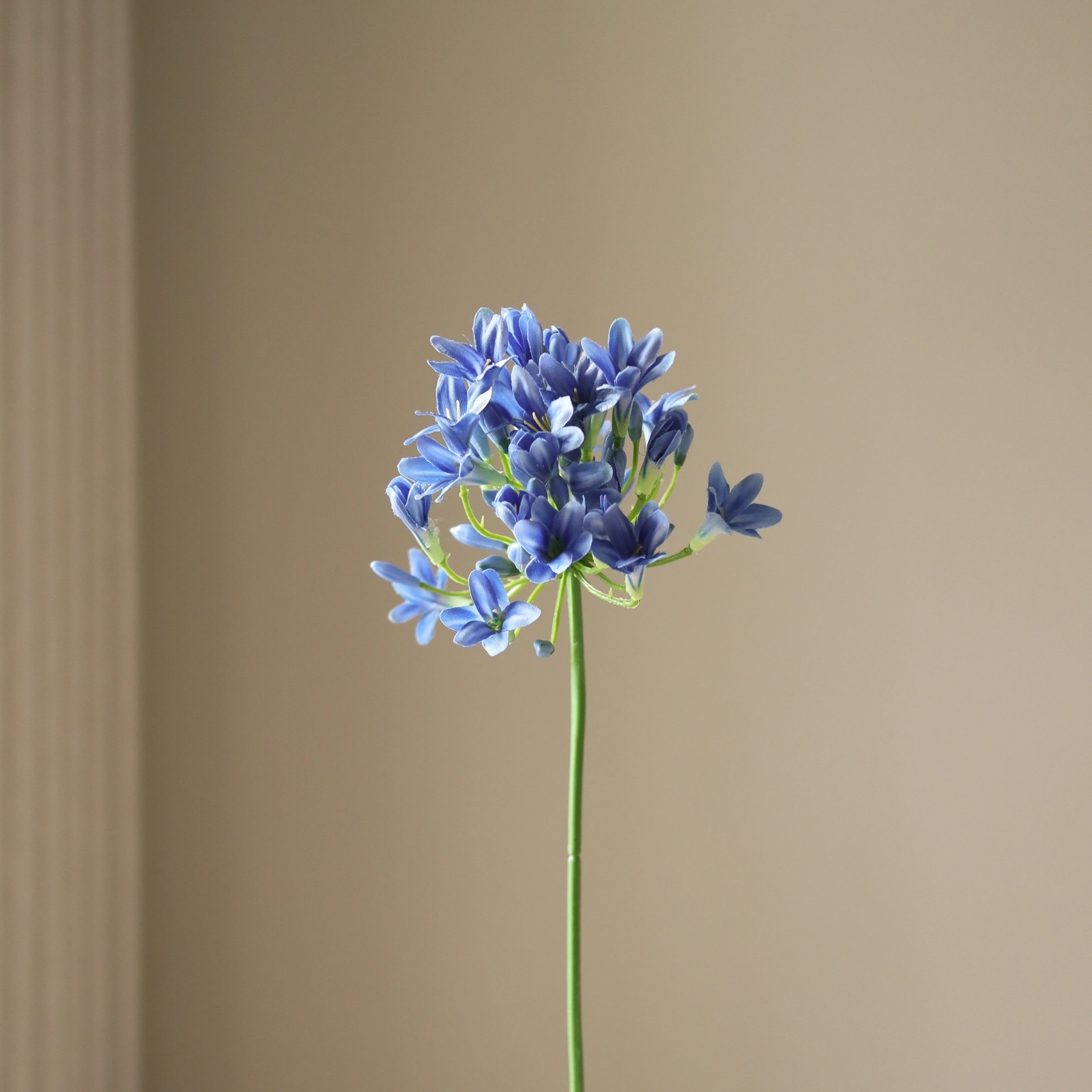 This Blue Agapanthus Flower features delicate, trumpet-shaped blossoms in varying shades of blue, clustered at the top of a slender green stem. The small, star-like petals display subtle gradients, deepening in tone toward the center. The blossoms are supported by fine green stalks branching from the core, adding to the flower's natural shape. The stem measures 75 cm in height.
