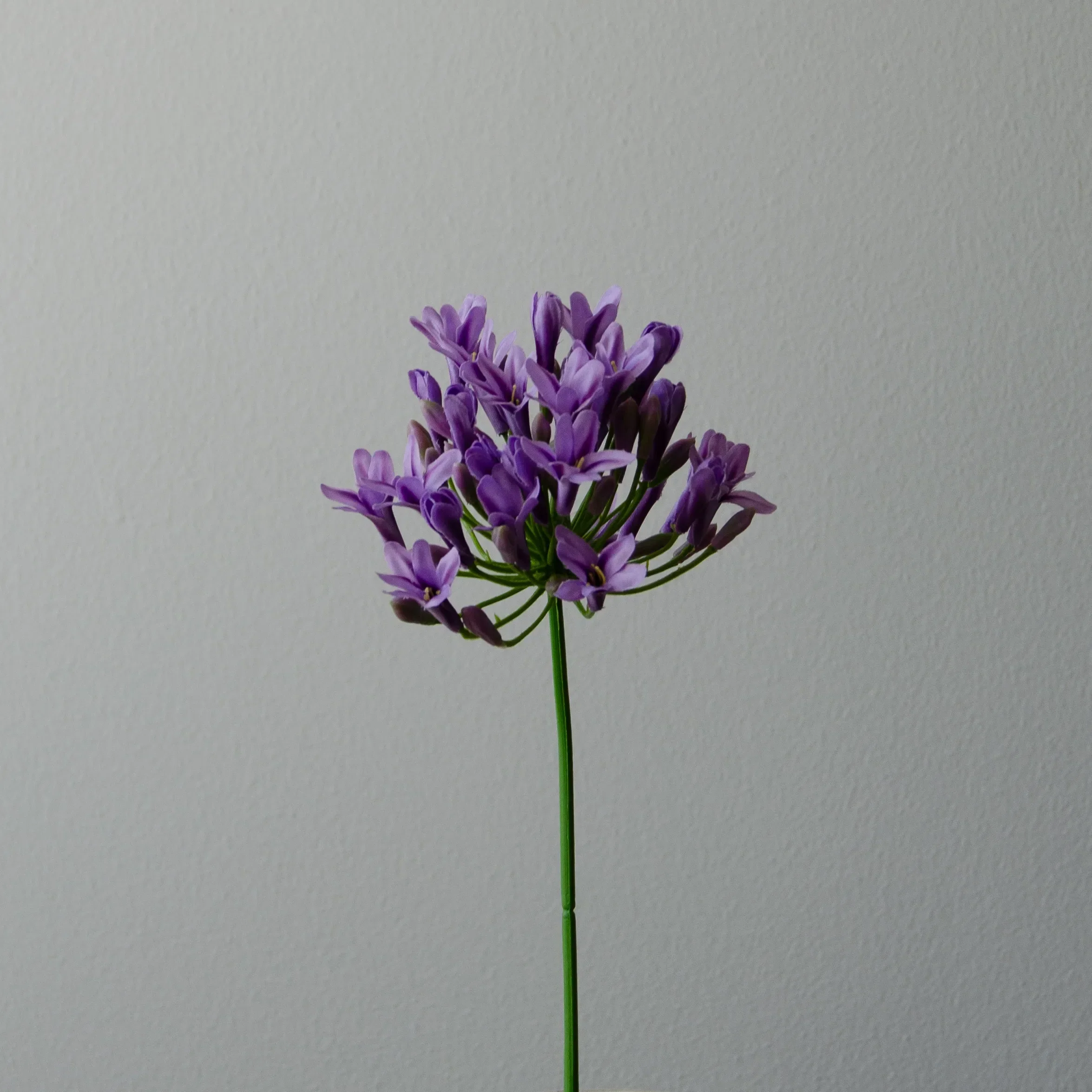 This Purple Agapanthus Flower features multiple delicate, trumpet-shaped blooms clustered at the top of a long, slender stem. The blossoms display a gradient of soft lavender to deeper purple hues, with subtle variations in tone across each petal. The structured green stem measures 75 cm in height.