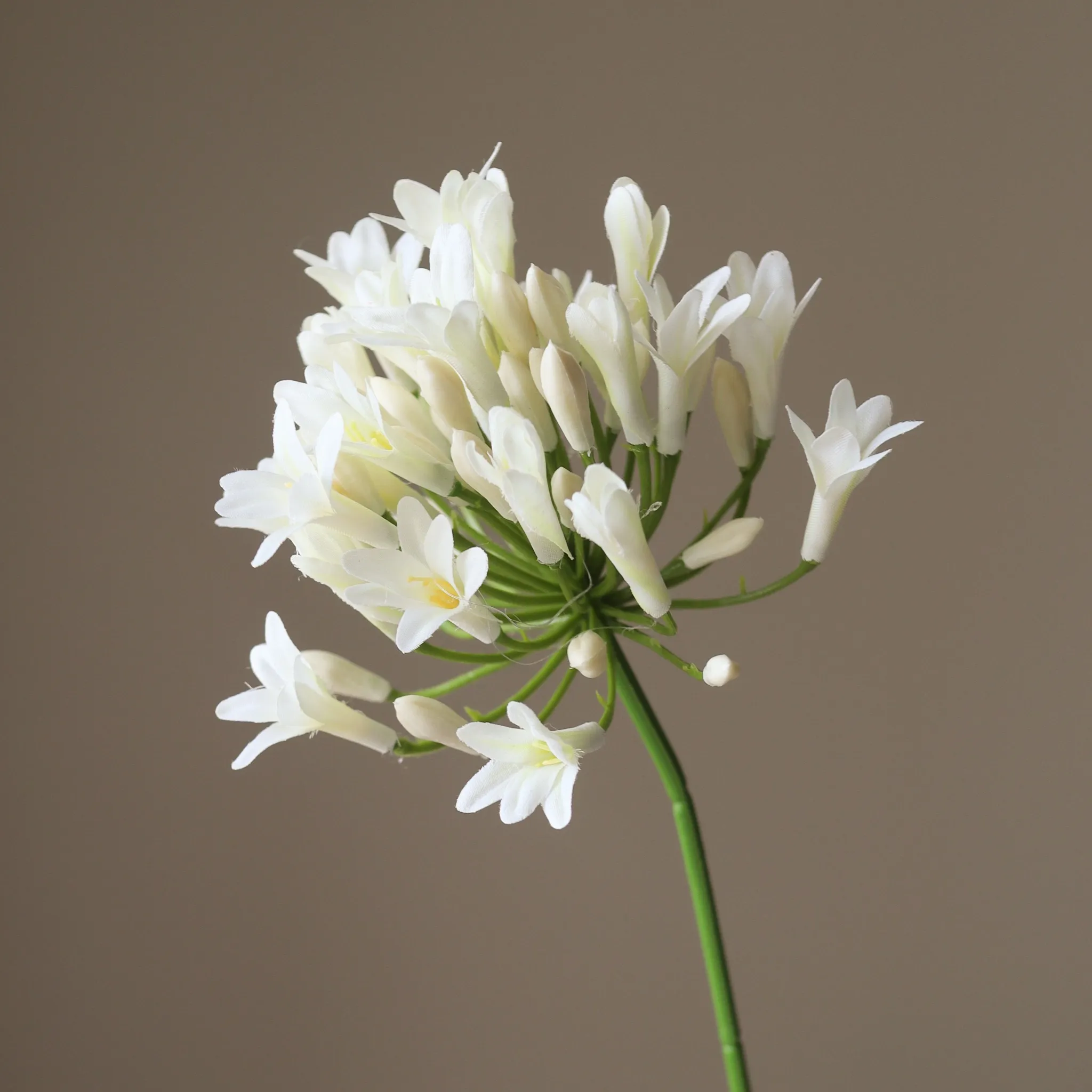 This White Agapanthus Flower features a cluster of delicate white blossoms, each with soft yellow centers, arranged in a rounded formation. The flowers emerge from slender green stems that extend to a height of 75 cm. Several small buds remain closed, adding a natural variation to the arrangement.