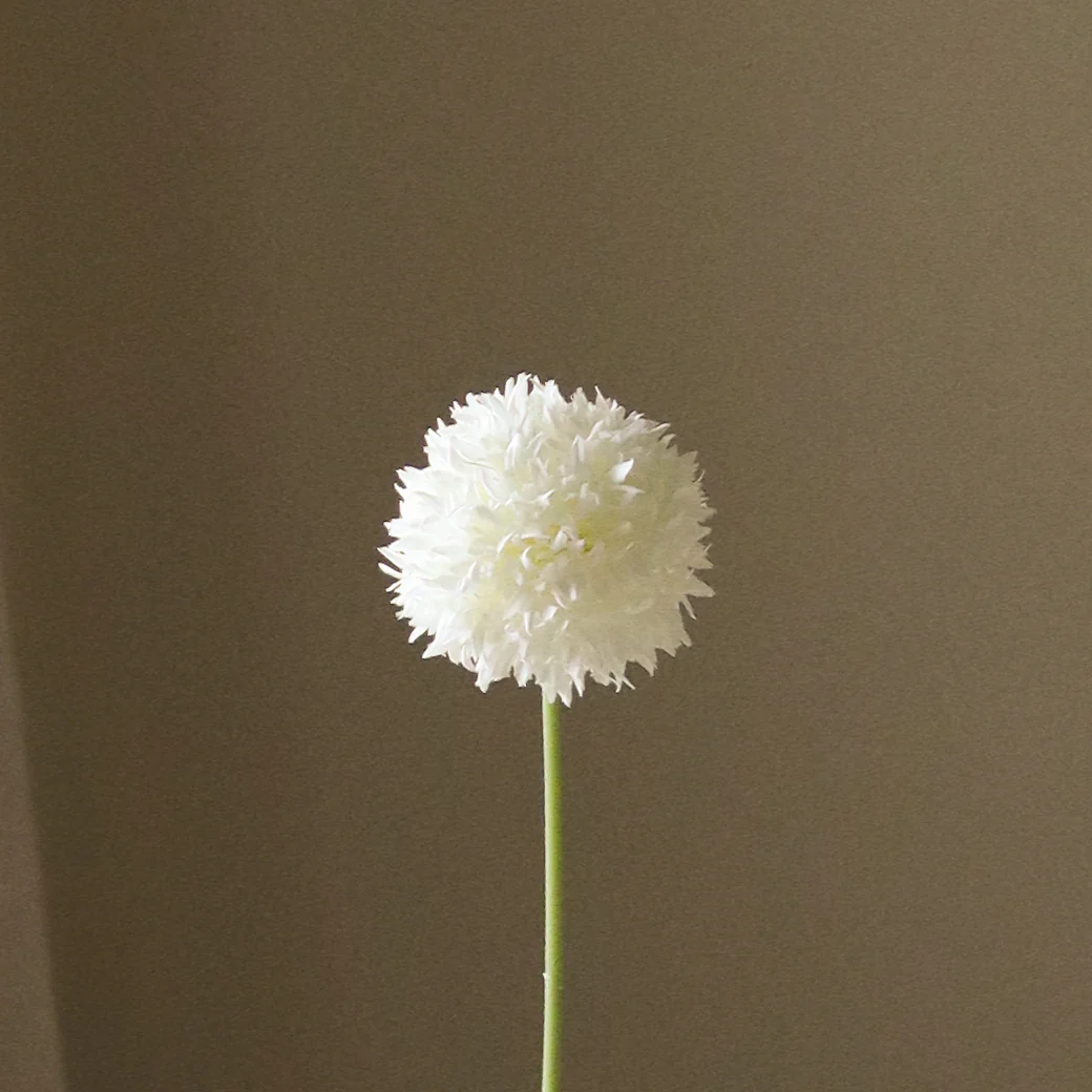 This White Allium Bulb has a spherical flower head with numerous soft, layered petals in a crisp white hue. The slender green stem has a smooth surface and a straight, upright form, measuring 43 cm in height.