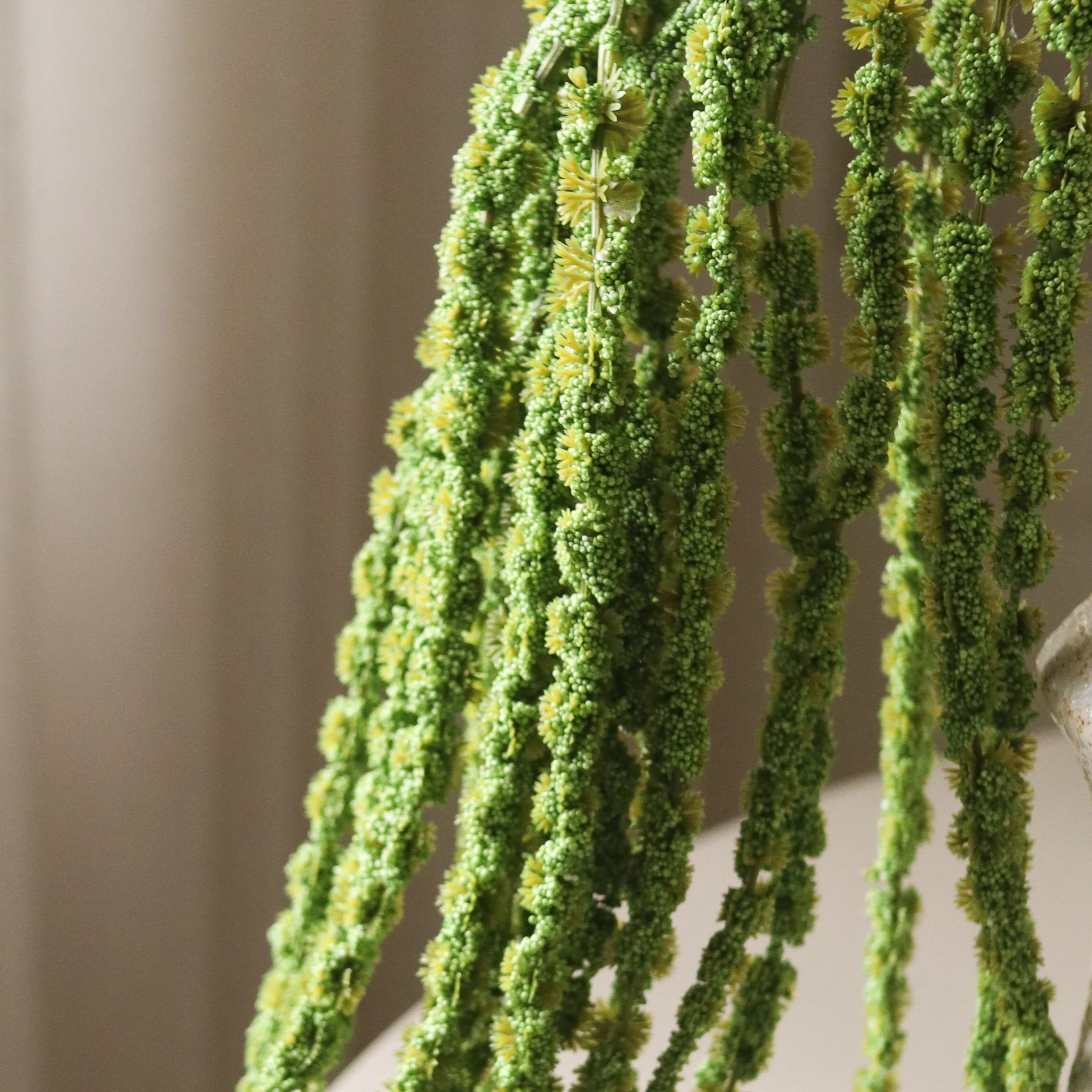 This Green Amaranthus Caudatus "Dreadlocks" Flower features cascading, textured green flower strands with a soft, almost velvety surface, creating a flowing effect. The blossoms are arranged on long, slender green stems, which measure 93 cm in height, with small, clustered buds along their length.