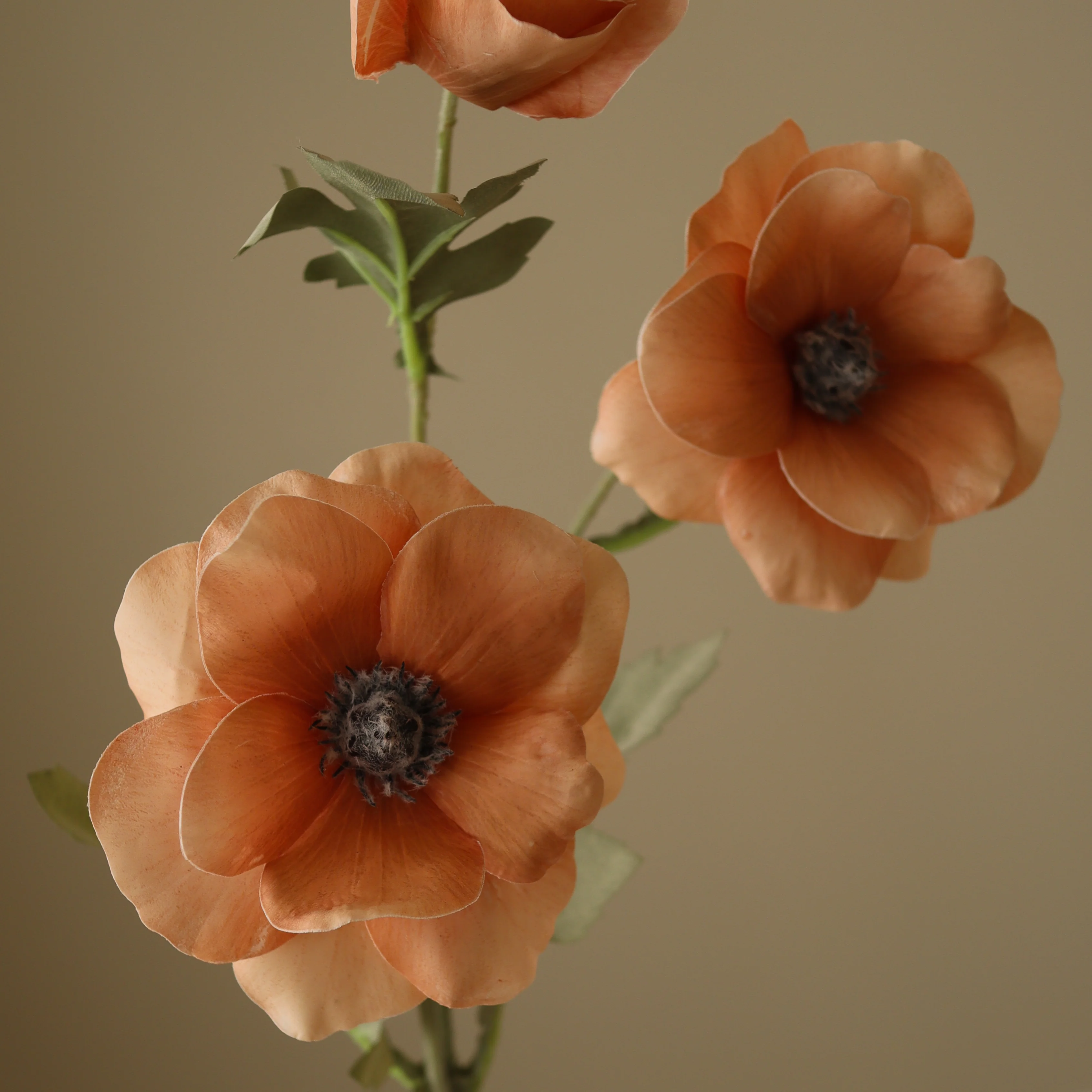 This Champagne Anemone Flower has three open blooms and one closed bud in a warm champagne hue with soft, slightly ruffled petals. The flowers are attached to a slender green stem with textured leaves, reaching a height of 70 cm.