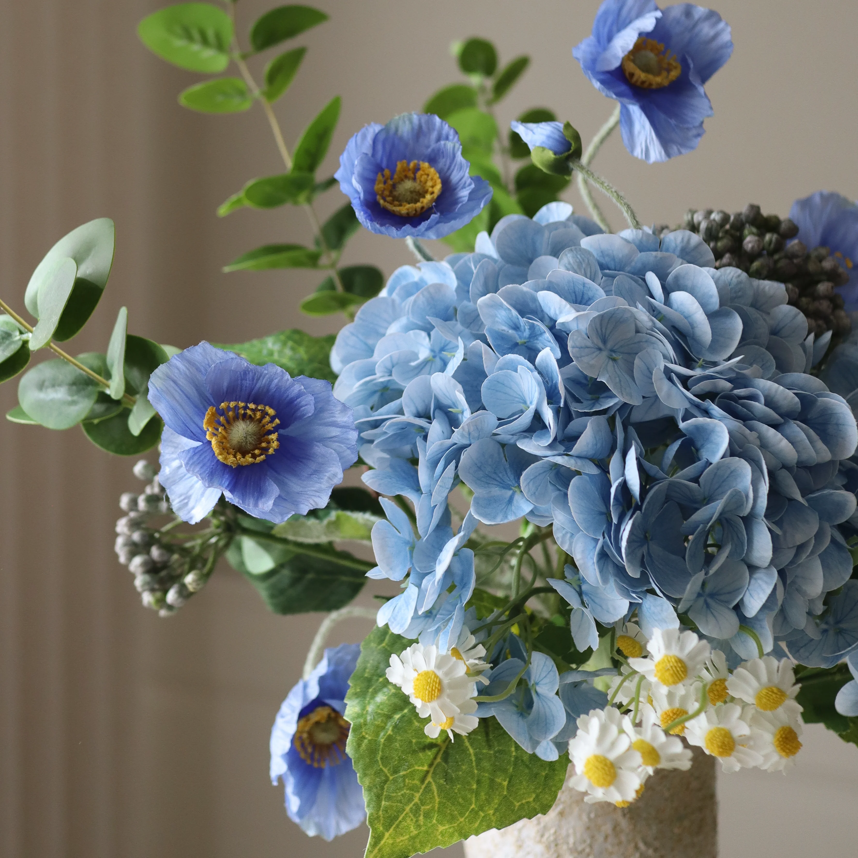 This bouquet brings together soft blue tones with delicate textures. Lush hydrangea blooms are paired with airy poppy flowers and subtle daisy accents, while eucalyptus leaves add a fresh touch.