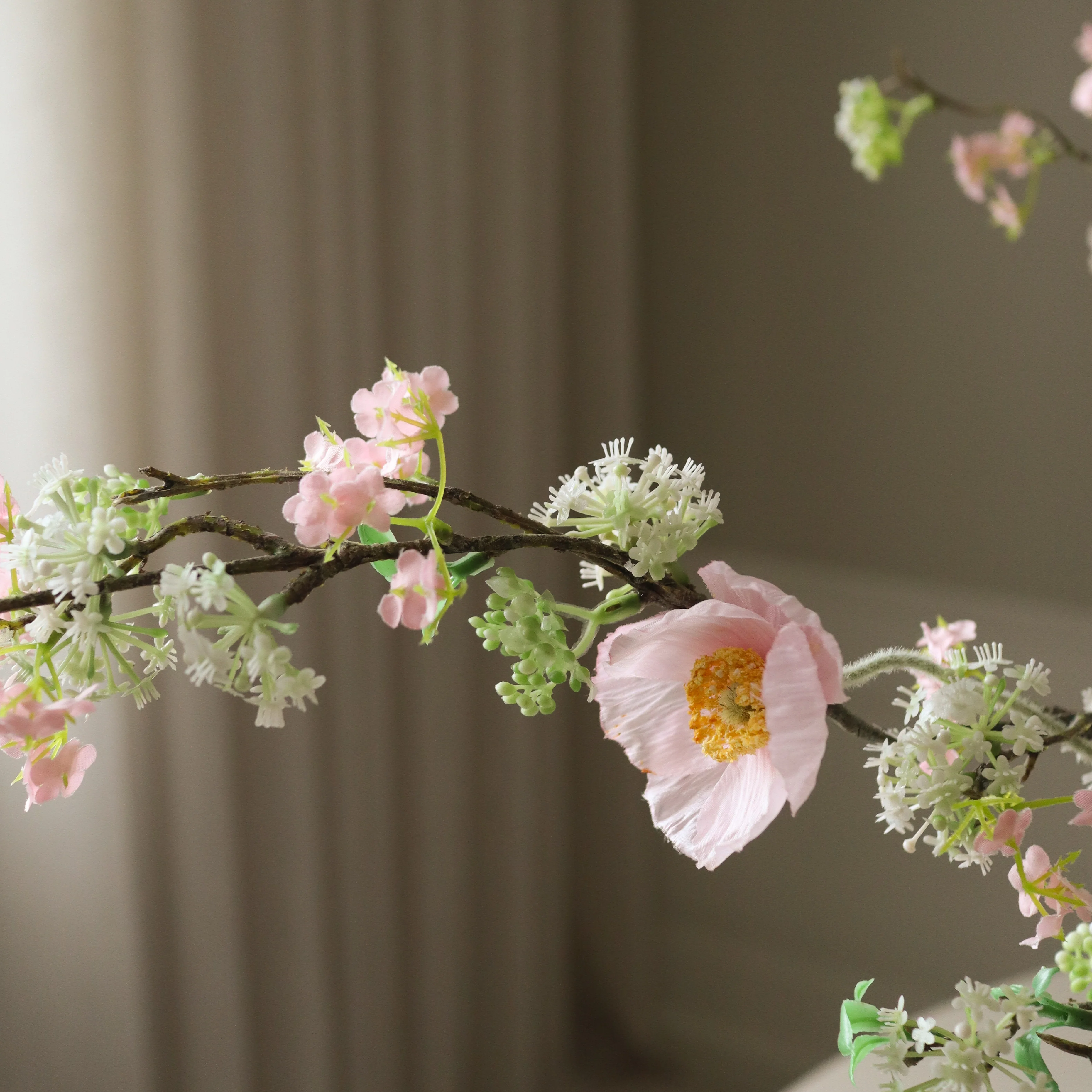 This bouquet features a delicate interplay of soft pink poppies and airy snow willow branches, creating a graceful and flowing composition. The cascading branches add movement, while the pastel tones evoke the serenity of early spring.