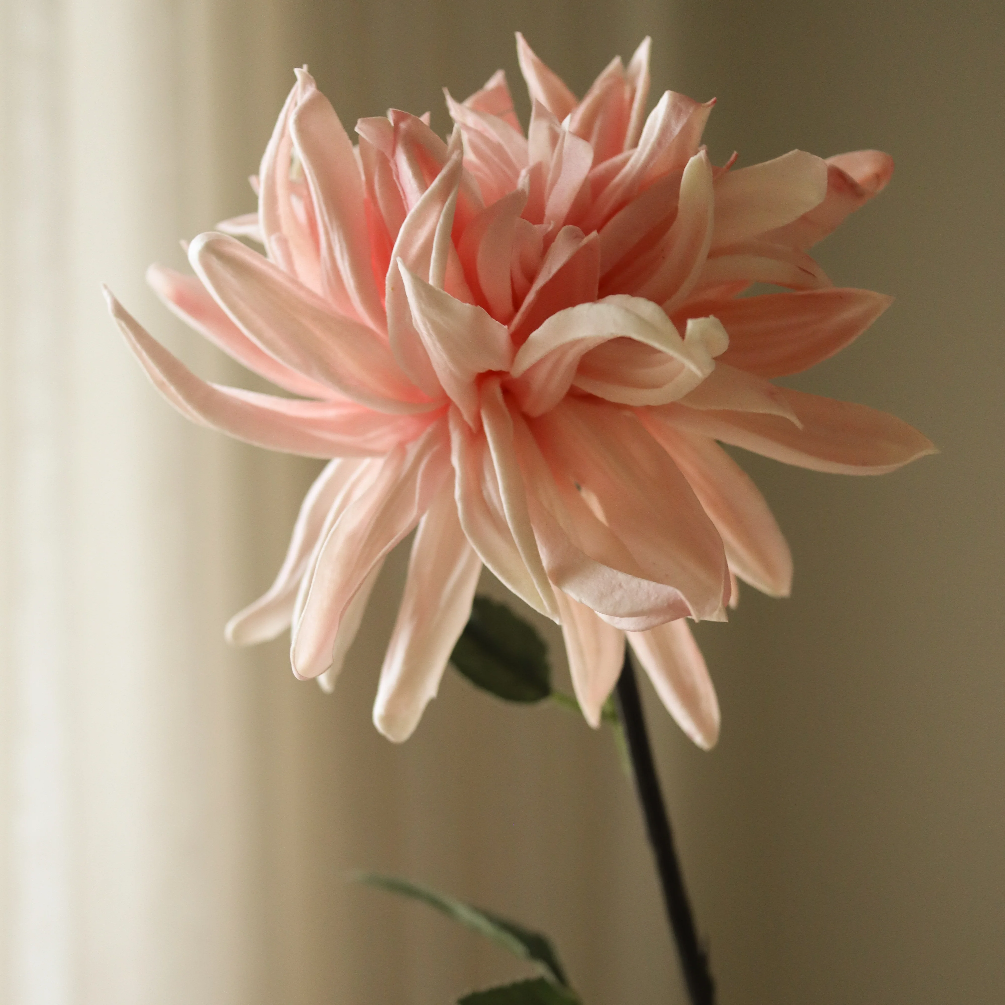 This Pink Cactus Dahlia Flower has long, slender petals in soft pink and blush tones, radiating from a dense central core. The structured petals curve naturally, adding depth to the bloom. It is supported by a sturdy dark green stem with elongated, slightly serrated leaves. The stem measures 72 cm in height.