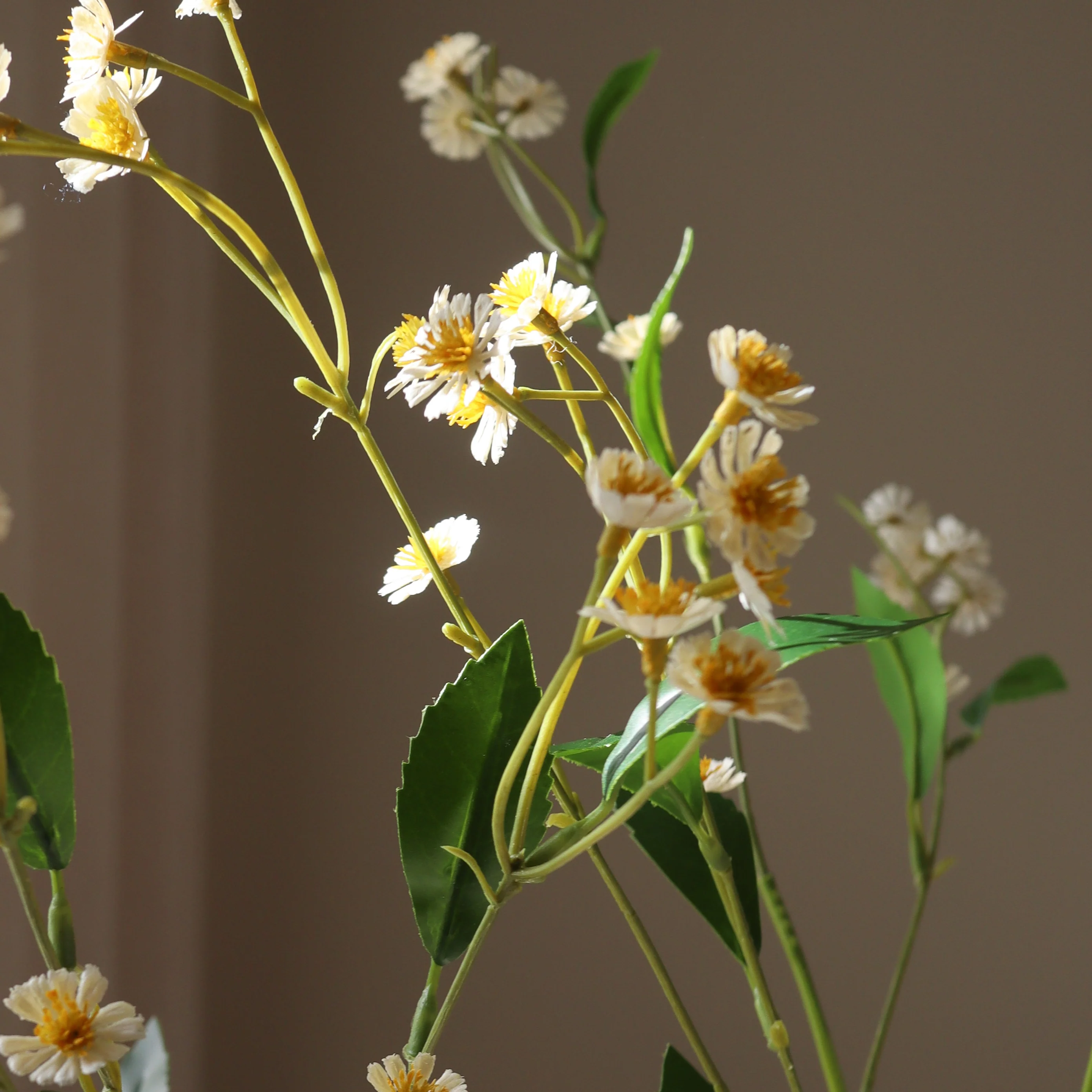 This White Chamomile Daisy Flower has multiple small, open blooms with bright white petals and soft yellow centers. The blooms are arranged along slender green stems with a soft texture and scattered, smooth green leaves. The stems reach a height of 86 cm, giving the arrangement a natural, airy appearance.