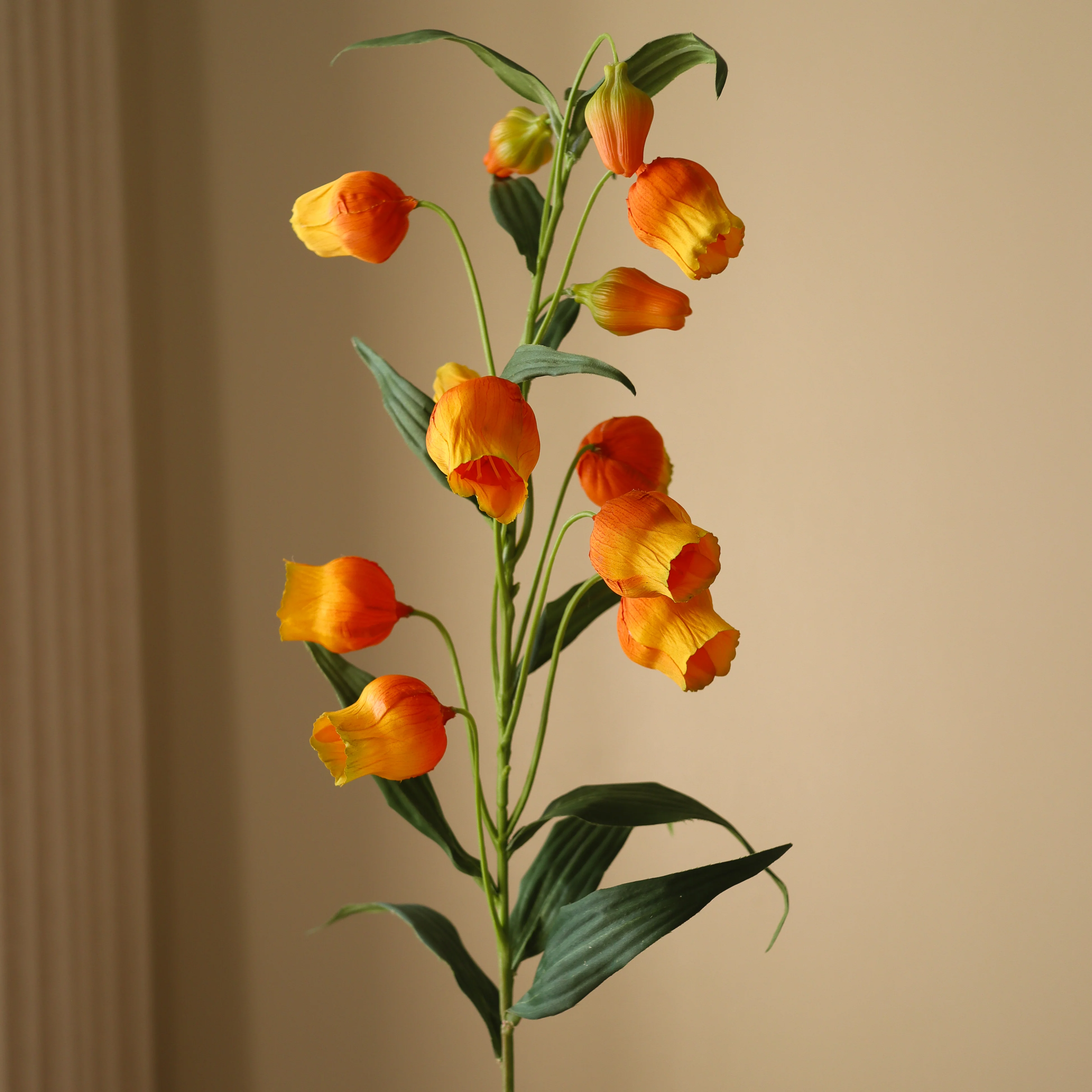This Orange Chinese Lantern Lily Flower features multiple bell-shaped blossoms in a vibrant orange hue, transitioning to a golden yellow at the petal edges. The blossoms have a structured form, with smooth, slightly translucent petals that subtly overlap. The flowers are arranged along a tall, slender green stem with elongated, slightly curved leaves that have a natural texture and visible veins. The stem reaches a height of 95 cm.