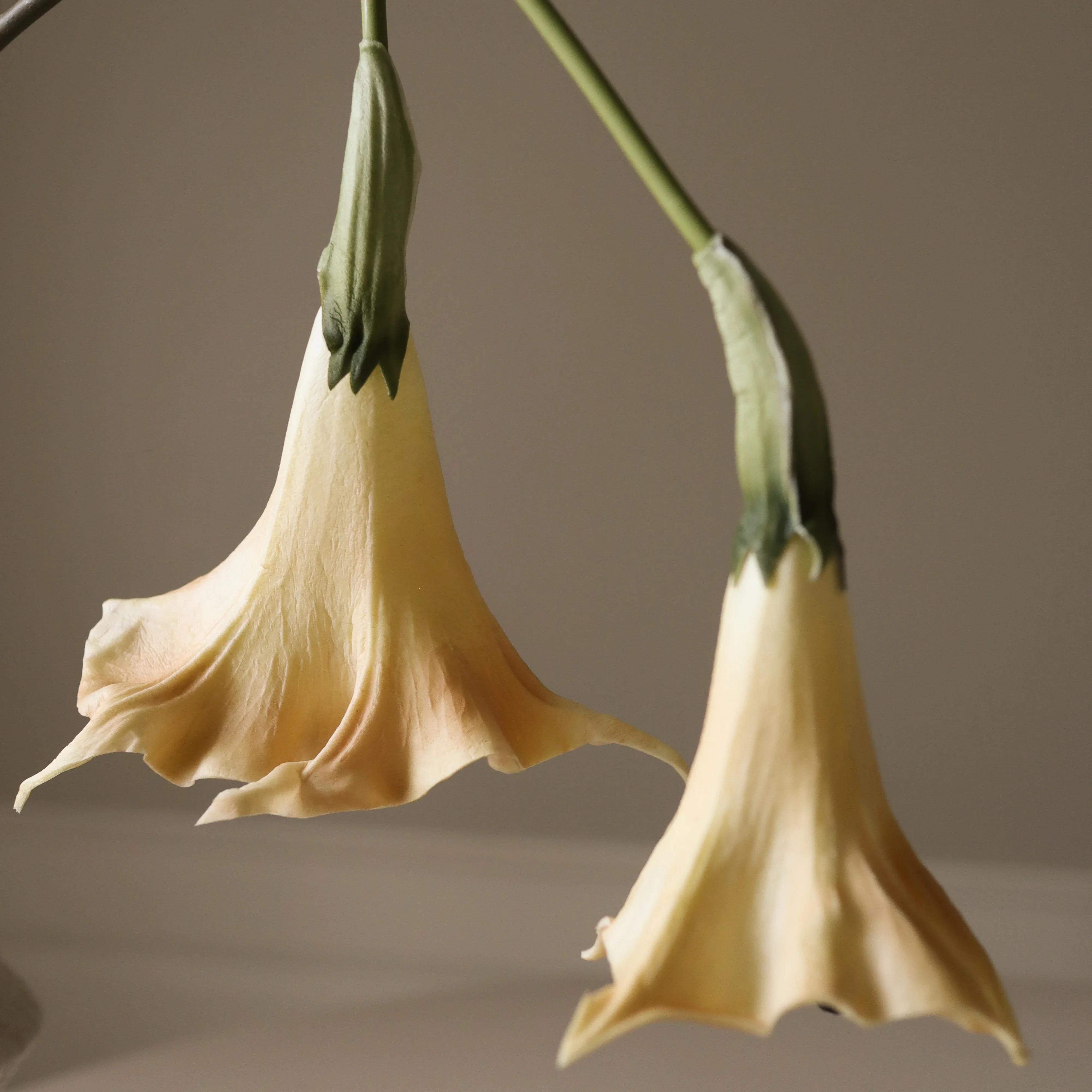 This Beige Datura Stramonium Flower displays elegant trumpet-shaped blooms in a soft, creamy beige hue with gentle ripples along the petal edges. The blossoms are gracefully suspended from slender, slightly curved pale stems, which measure 70 cm in height, and are accompanied by subtle, elongated green bracts.