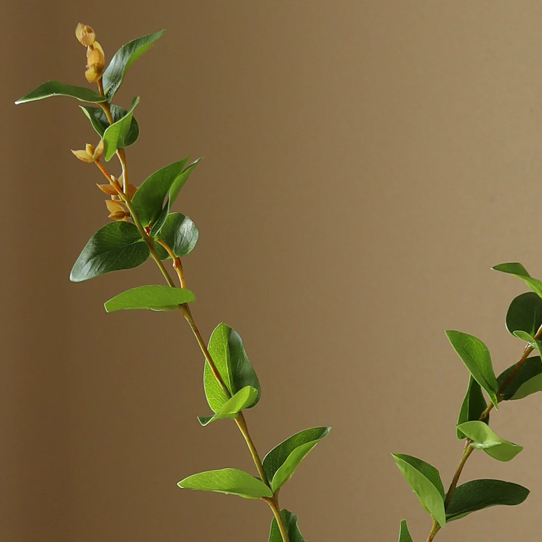 This Green Eucalyptus Leaves stem features multiple slender branches with smooth, oval-shaped leaves in a rich green shade. Small, delicate yellow buds emerge along the stems, adding subtle texture. The leaves are supported by a slender stem and stand at a height of 64 cm.