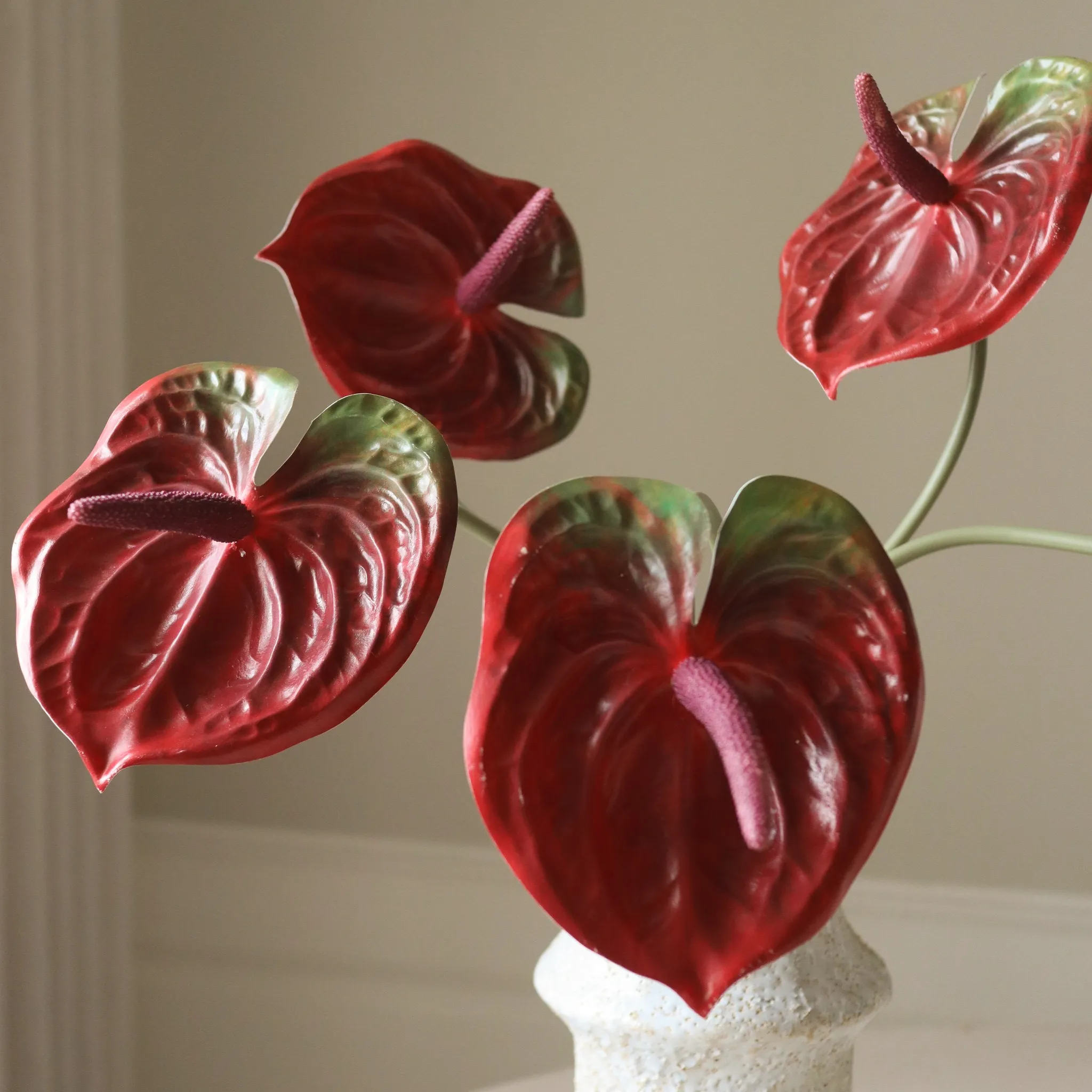 This bouquet showcases sleek, sculptural elegance with deep red anthuriums arranged in a bold yet refined composition. The smooth, curved petals and elongated stems create a striking visual balance, making a statement with minimal elements.