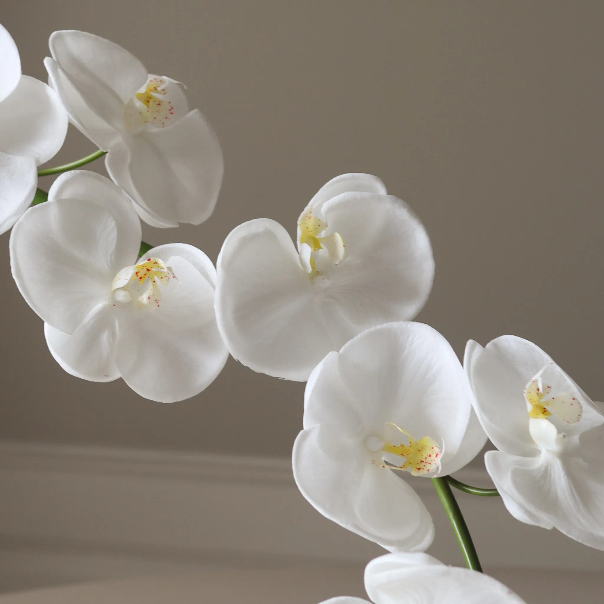 This White Grand Orchid Flower features an elegantly arching stem adorned with multiple soft white blossoms, each with a delicate yellow center. The petals are smooth with a natural curvature, highlighting the orchid’s refined structure. The stem measures 150 cm in height, complementing its graceful shape.