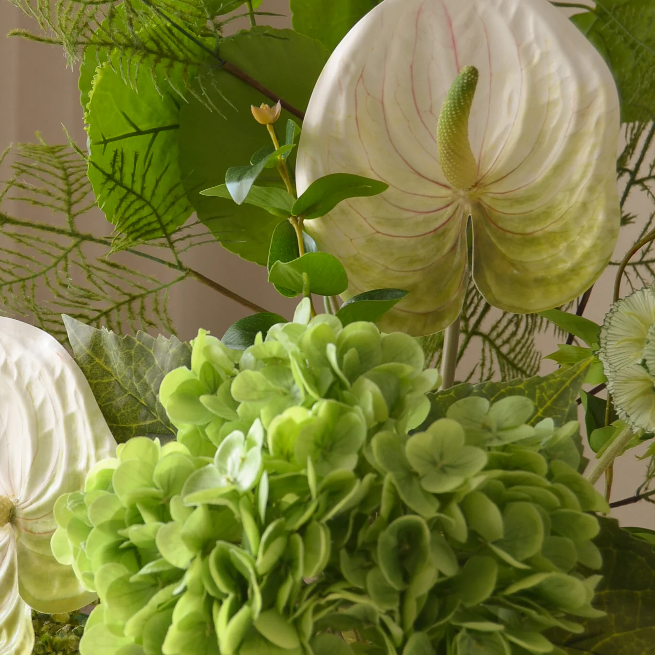 This bouquet embraces a harmonious blend of soft greens and natural textures, creating a fresh and serene composition. Lush hydrangea blooms add fullness, while sculptural anthuriums and delicate seedpods introduce refined details. Flowing amaranthus and airy ferns bring movement, complemented by structured foliage for depth.