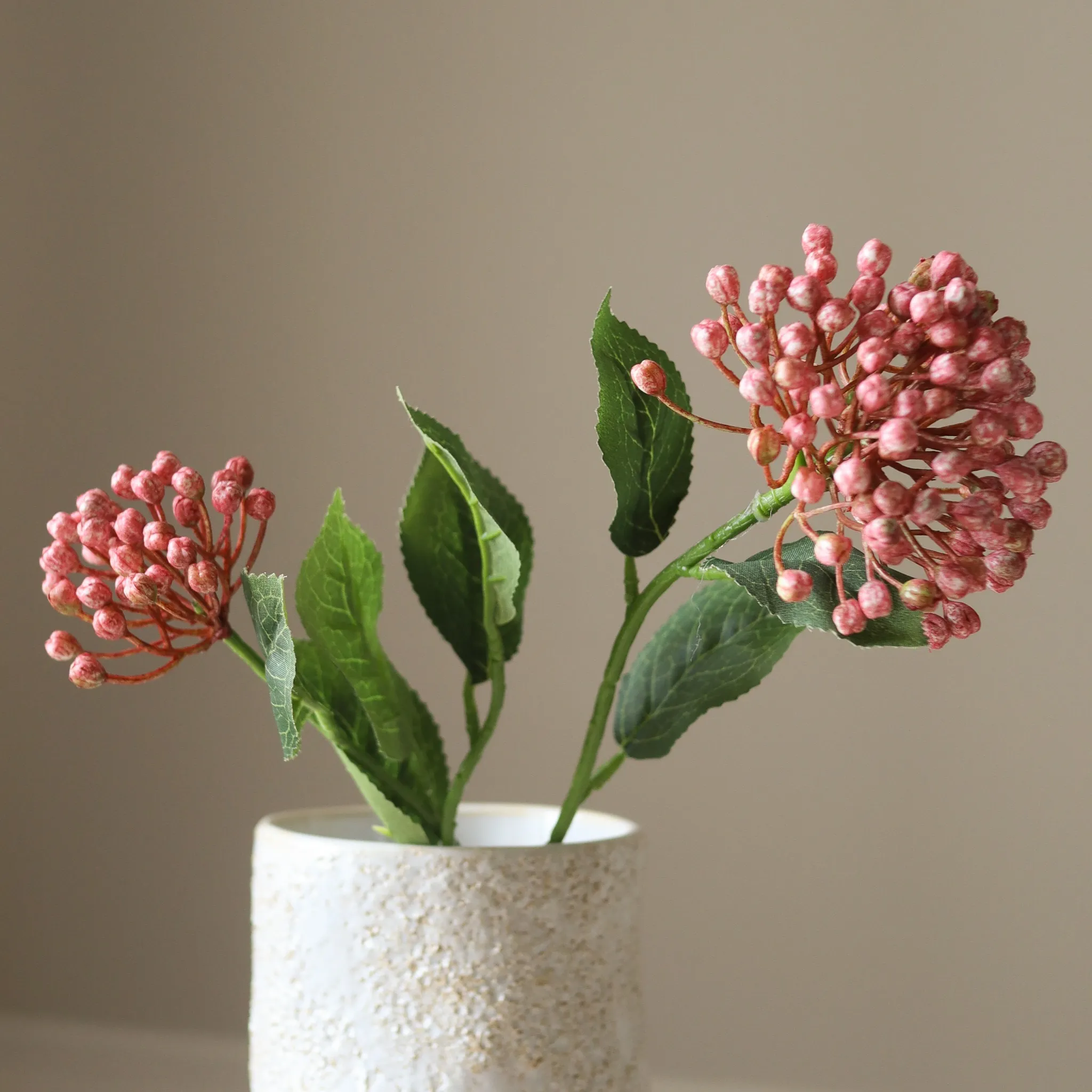 This Pink Hydrangea Berry Branch features clusters of small, textured berry-like buds in rich pink tones. The buds contrast with the dark green, veined leaves that extend from the sturdy, natural-looking stem. The stem stands at a height of 54 cm.