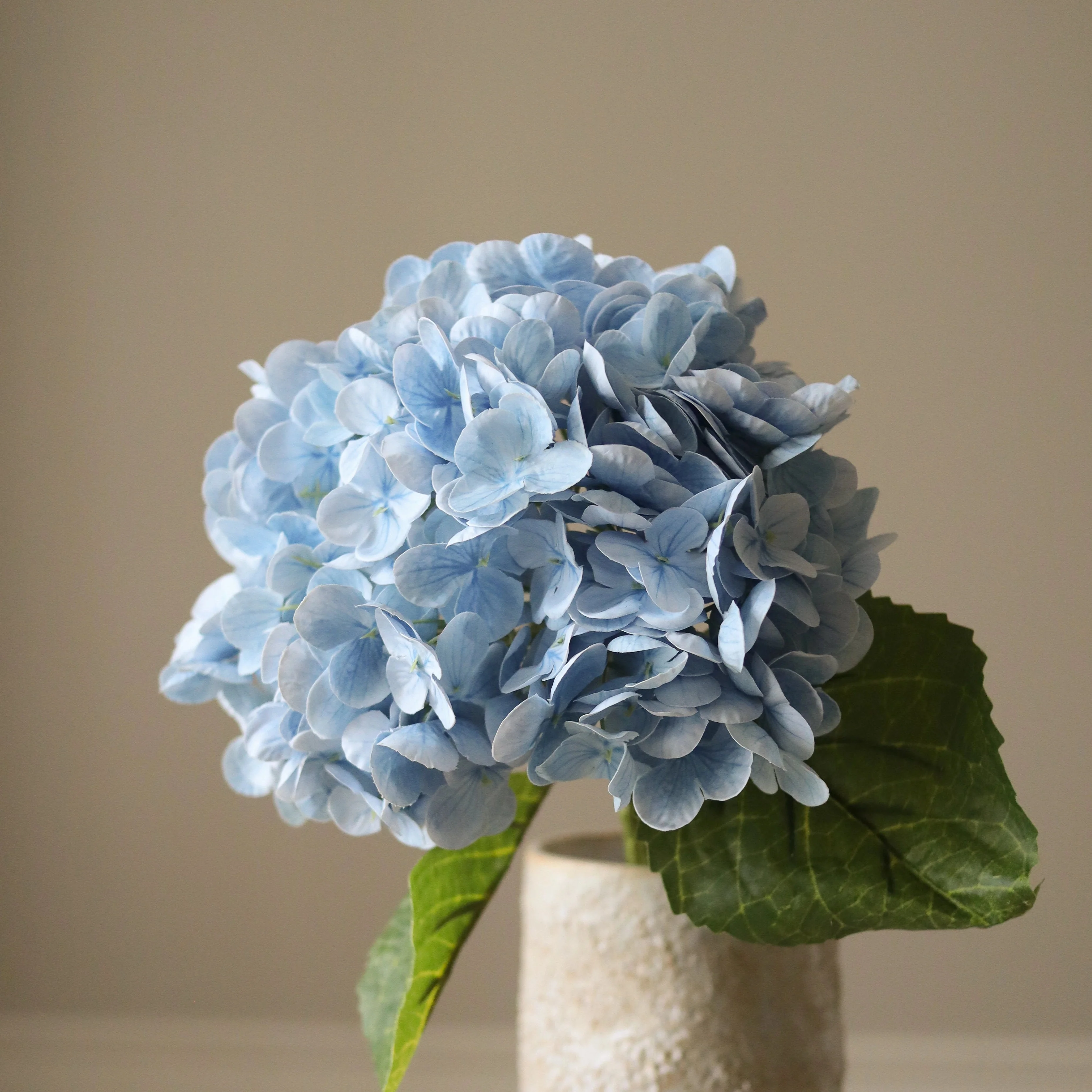 This Light Blue Hydrangea Flower stem features a single, rounded bloom composed of numerous delicate petals in soft blue hues with subtle variations in tone. The petals have a smooth texture, and the bloom is accompanied by two textured green leaves with prominent veins. The flower is attached to a sturdy, green stem and reaches a height of 49 cm.