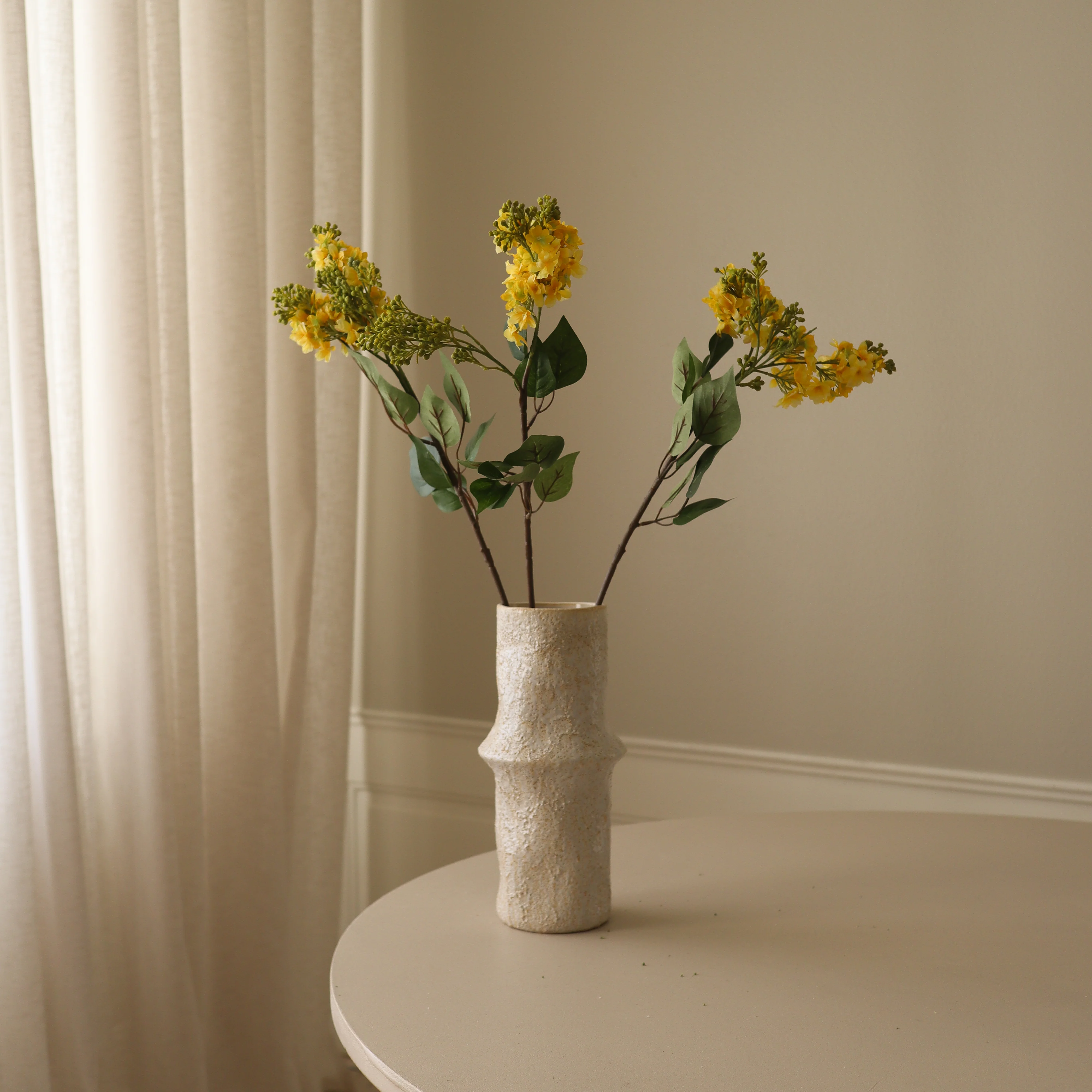 This Yellow Lilac Flower features delicate clusters of golden-yellow blossoms along a naturally structured stem. The small blooms are accented by green buds and deep green leaves, creating a balanced composition. The stem reaches a height of 73 cm.