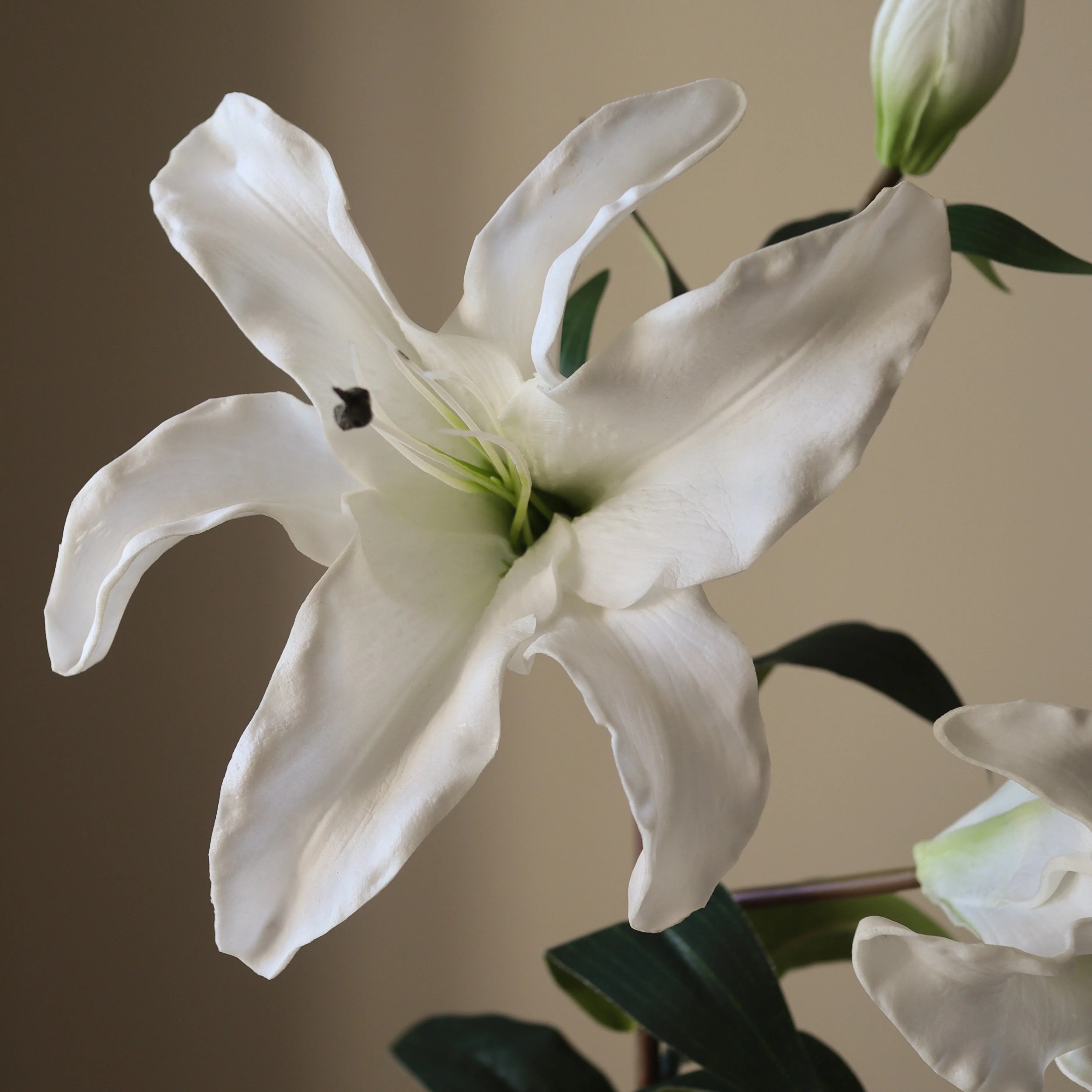 This White Majestic Lily Flower features large, gracefully curved petals in a pure white shade, with a soft green center and delicately arching stamens. The blossoms are positioned along a sturdy, dark green stem, which measures 94 cm in height, and is complemented by smooth, elongated leaves.