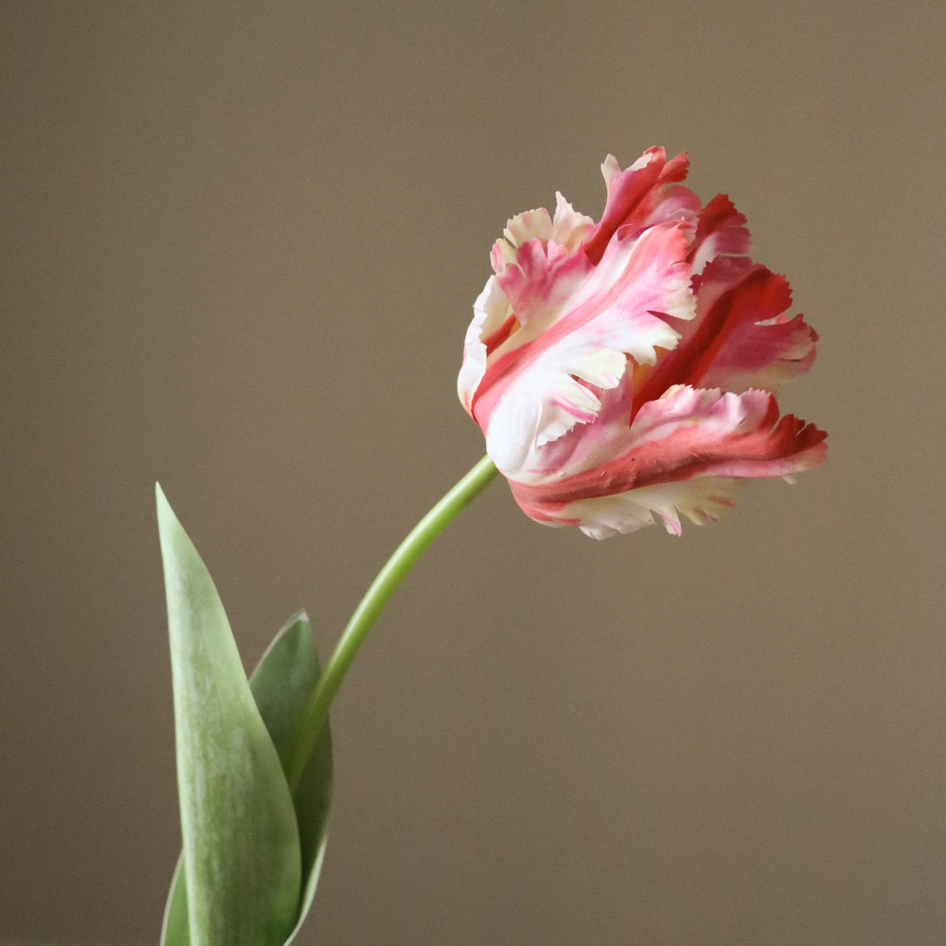 This Red Parrot Tulip Flower has an intricate design with ruffled petals in vibrant red with soft white accents. The single flower head features delicate fringed edges, creating a natural, dynamic appearance. The long green stem has a gentle curve and is complemented by smooth, elongated leaves. The stem measures 67 cm in height.