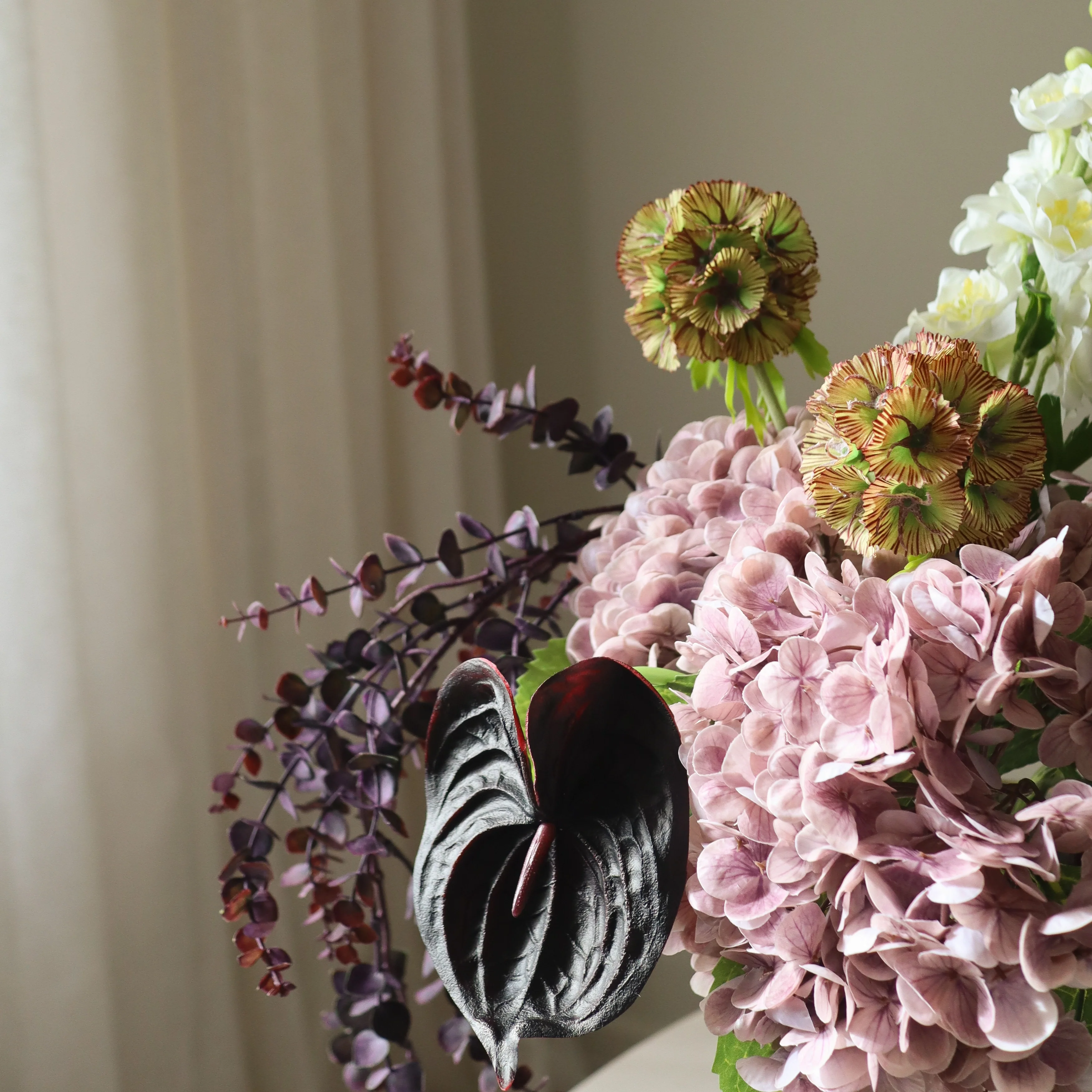 This bouquet features a rich arrangement of deep purple and muted tones, complemented by structured elements and soft greenery. The combination of hydrangea, scabiosa, and delphinium adds dimension, while the dark anthurium introduces a bold focal point. The eucalyptus branches extend outward, enhancing the bouquet's shape and balance.