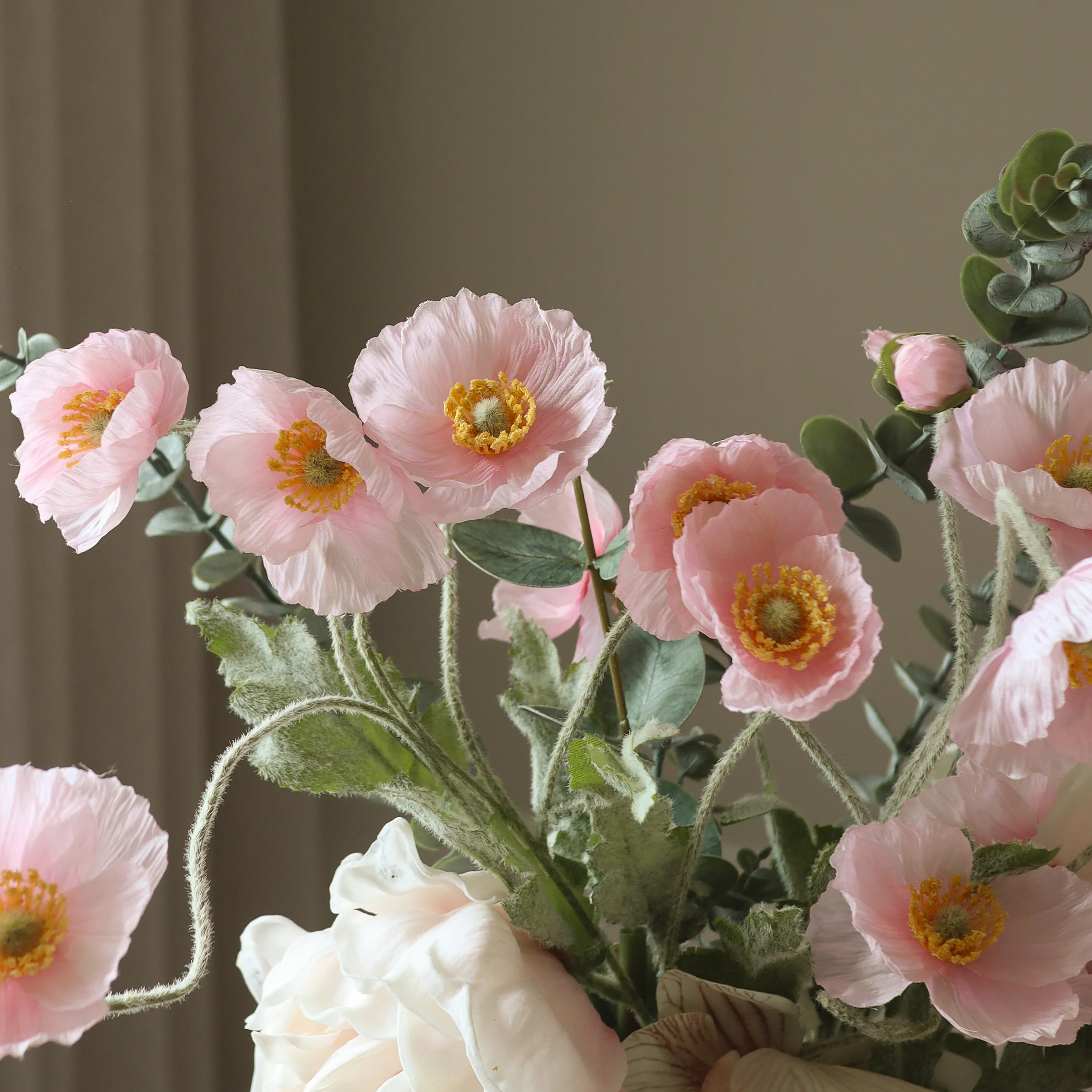 This bouquet features a blend of soft pink and neutral tones. The light pink poppies add an airy structure, while the large peony flowers provide a lush, full presence. A single beige orchid elegantly drapes downward, enhancing the bouquet’s sculptural appeal.