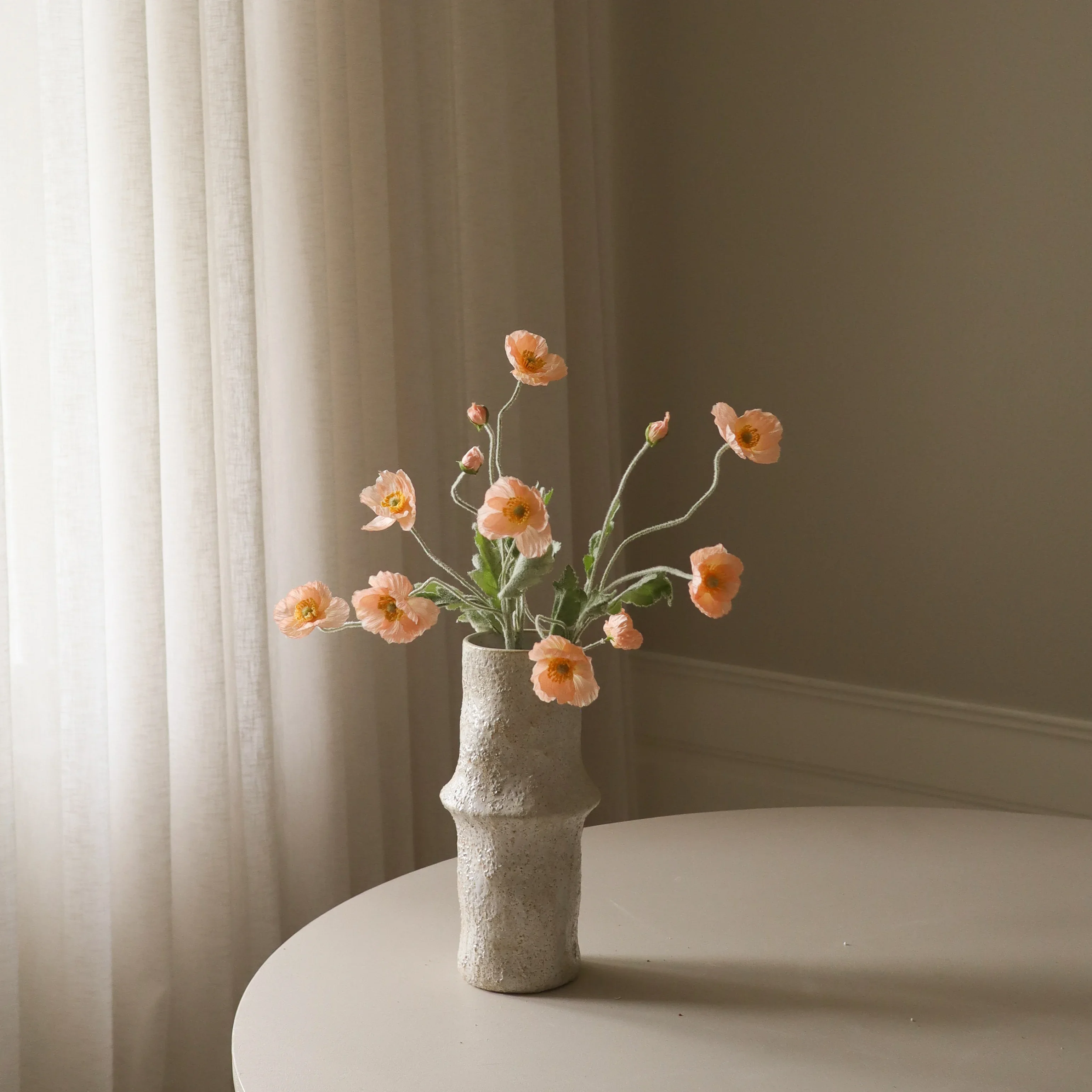 This Coral Poppy Flower has three open blooms and one closed bud in a warm coral hue with soft, slightly crinkled petals. The flowers are attached to a slender green stem with textured leaves, reaching a height of 56 cm.