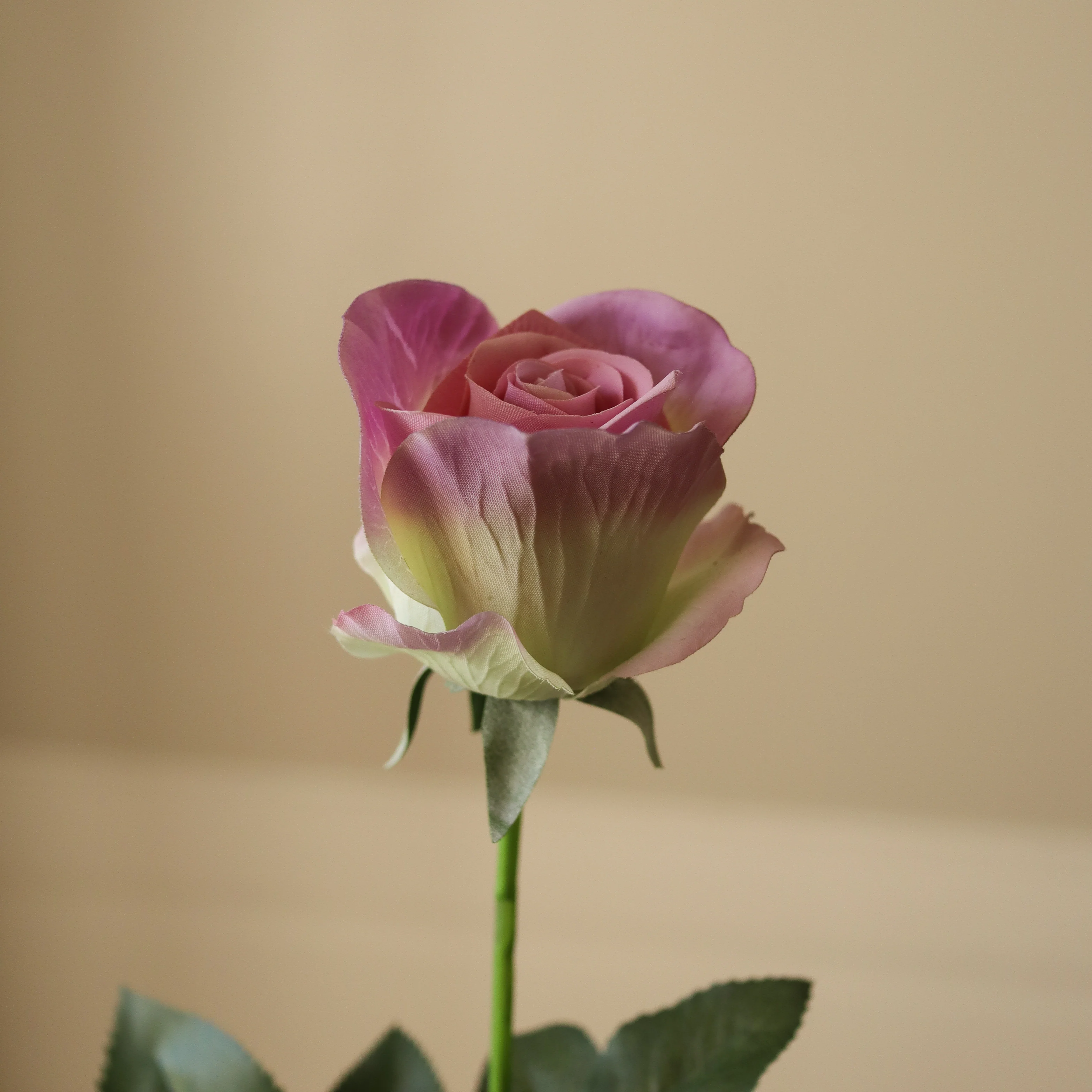 This Purple Premium Longstem Rose features a single, delicately layered bloom with soft petals in a gradient of lavender and cream hues. The detailed design closely resembles fresh roses, with one flower head on a slender, green stem accompanied by textured, deep green leaves. The height of the stem is 65 cm.