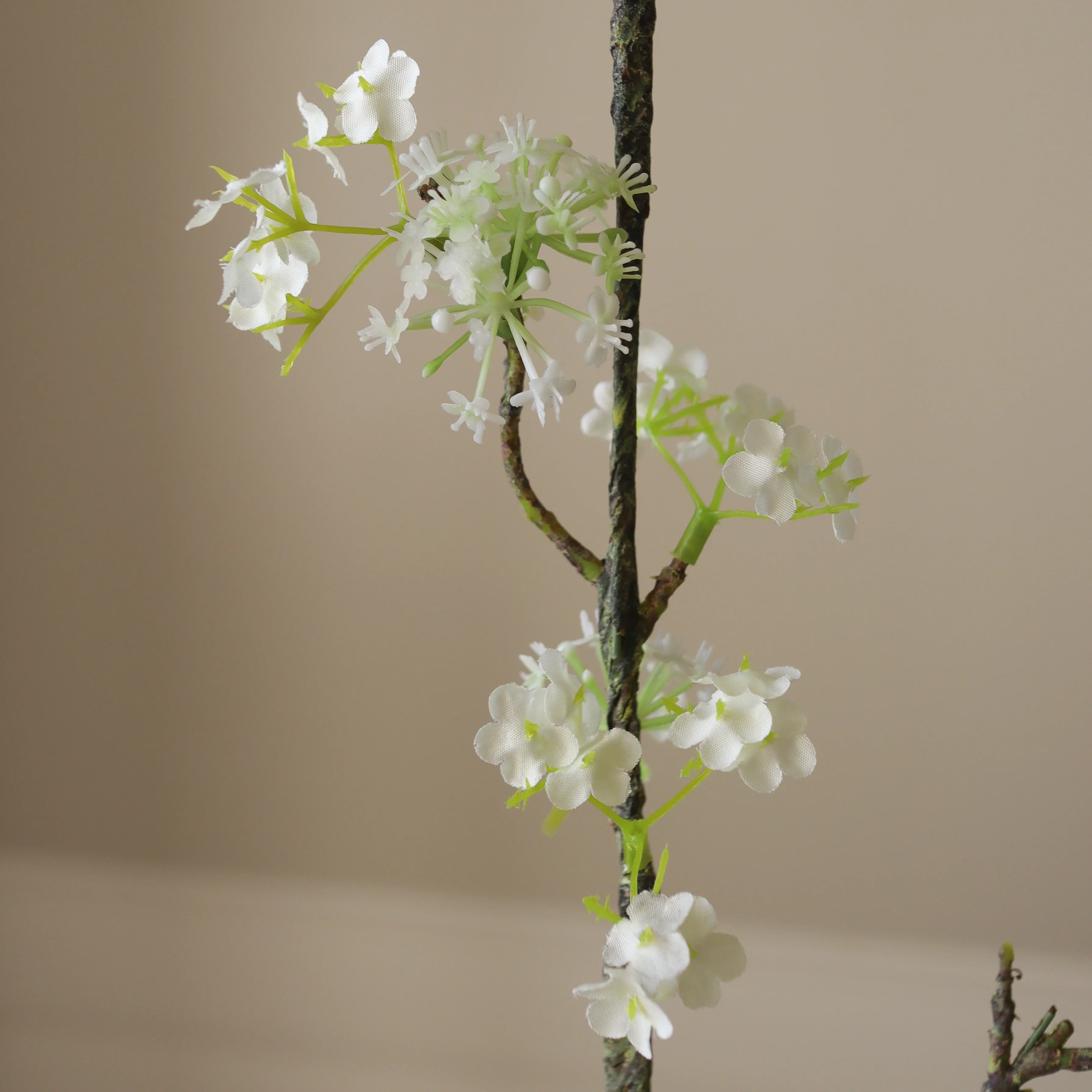 This White Snow Willow Branch features delicate clusters of small, crisp white blossoms interspersed with tiny green buds. The flowers are arranged along a gracefully arching dark brown stem, which measures 104 cm in height. Small, fresh green leaves emerge between the blossoms, adding a natural contrast to the branch's slender form.