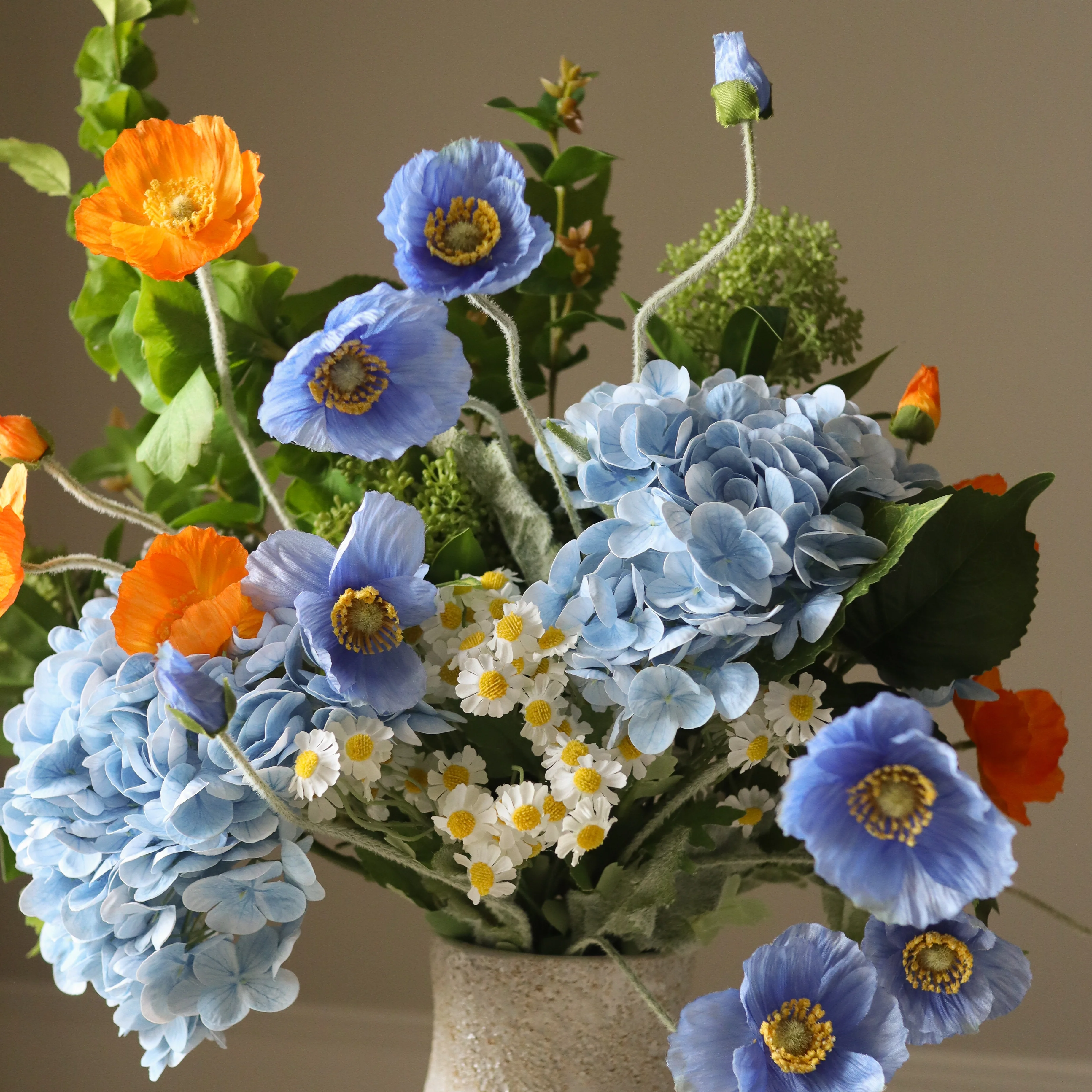 This bouquet blends soft blue and fresh green tones with vibrant orange accents, creating a lively yet balanced composition. The textured elements and cascading stems add dimension, making it a striking centerpiece.